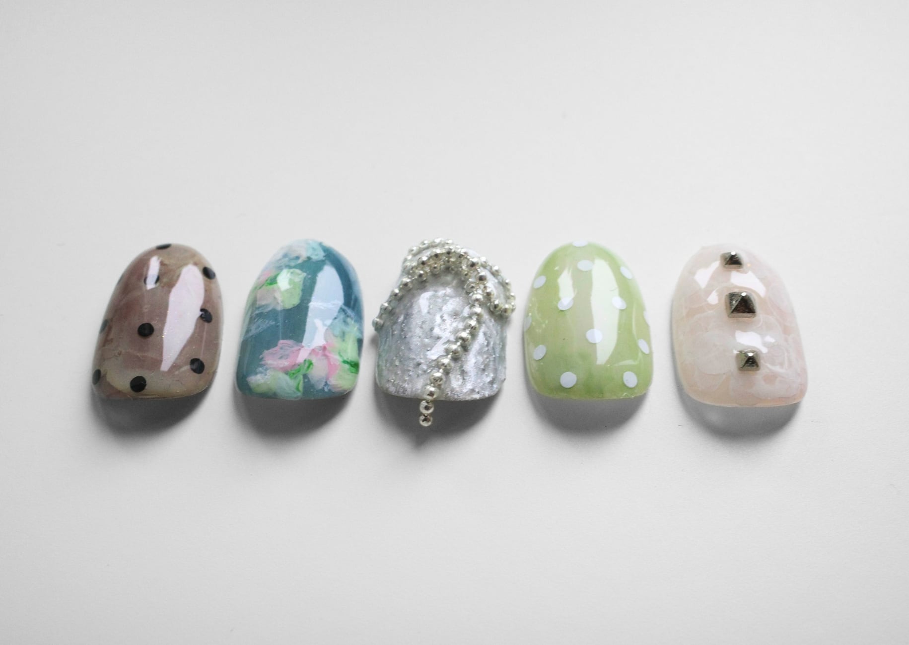 ★中指のデザイン(リボン)は立体感があり他と比べ少し引っかかり等があるものとなっておりますのでご了承ください。 ◾️初めてご利用頂きますお客様は、オーダー方法/注意事項を必ずお読み頂きの上ご購入をお願い致します。 ◾️お好きな組み合わせでお選び頂ける様、《5本1セット=5500円》で販売しております。 左右同じセットをご希望の場合は同一商品を2点ご購入お願い致します。 ◾️左右ともに、画像左側から親指→順に右側が小指のアートとなります。